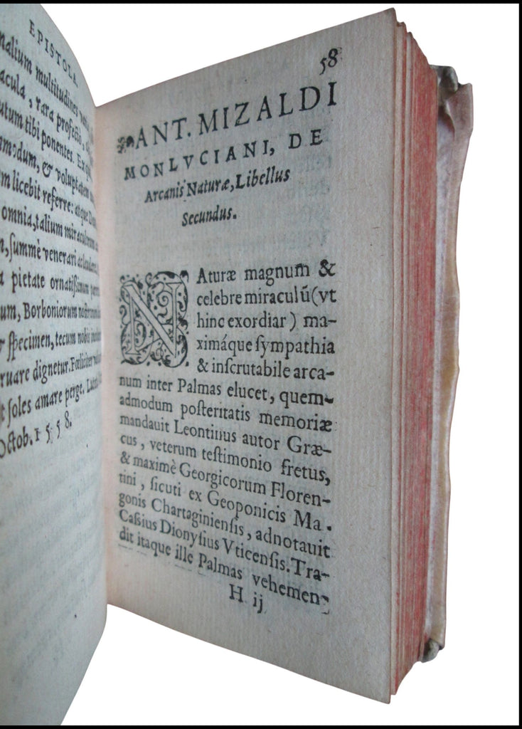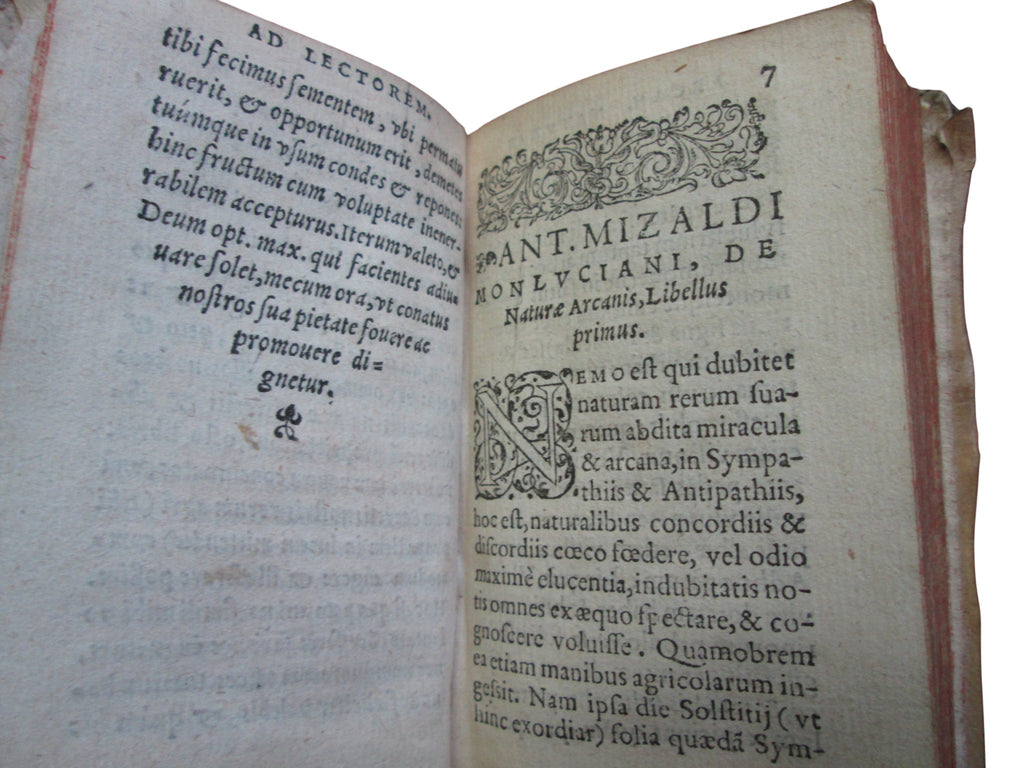 [Book of Secrets, Occult, Medicine] Antoine Mizauld. De Arcanis Naturae, Libelli Quatuor. Paris: Jacques Kerver, 1558. First edition, 32 mo (11 cm x 7.5 cm), text complete (157 pages), lacking title page; elaborate headers and end-pieces with decorative woodcut initials; divided into four books discussing secret properties of plants and herbs, zoological observations, and historical references; contemporary vellum boards with partially legible ink spine titling, several passages censored with ink (mainly in Book III), otherwise well-preserved [Wellcome cat. of printed books, v. 1, no. 4352, Adams M1496].